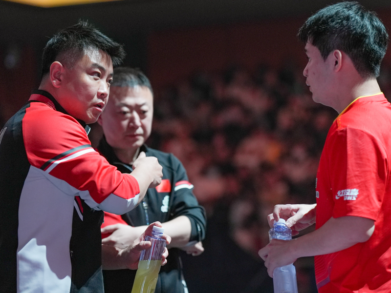 新华社像片,成都,2025年11月30日\n 11月30日,中国队评释王皓(左)在男单比赛中指点林诗栋。最终,林诗栋3比0投降中国香港队选手林兆恒。\n 当日,在四川成都举行的2025年海外乒联夹杂团体全国杯第一阶段A组小组赛中,中国队总比分8比1投降中国香港队。\n 新华社记者 王曦 摄